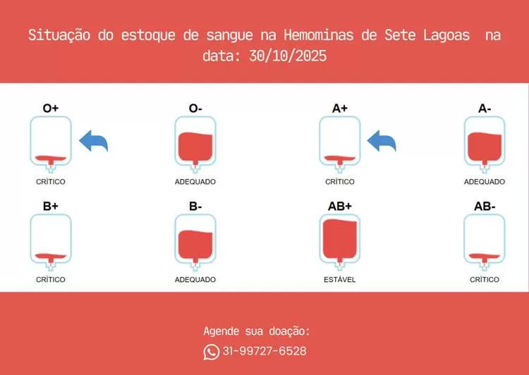 O Hemominas em Sete Lagoas está com uma campanha para atrair doadores de sangue. Estoques dos tipos A+ e O+ estão em níveis críticos – porém são os mais comuns e isso mostra quantas pessoas podem ajudar.