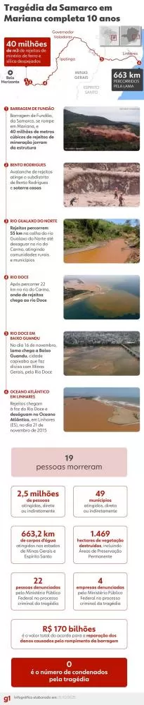Dezenove pessoas morreram, comunidades foram riscadas do mapa, e o Rio Doce nunca mais foi o mesmo. Mas, nesses dez anos, ninguém foi responsabilizado criminalmente pela tragédia. Infográfico ao final da reportagem reconta a tragédia e mostra os principais números.