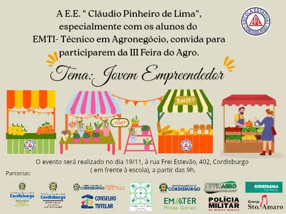 A Escola Estadual Cláudio Pinheiro de Lima, através do EMTI - Técnico em Agronegócio, convida a comunidade de Cordisburgo para participar da III Feira do Agro, que será realizada no próximo dia 19 de novembro. O evento acontecerá na Rua Frei Estevam, em frente à escola, a partir das 9h.