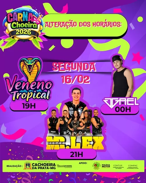 A programação do CarnaChoeira 2026 desta segunda-feira (16/02) sofreu alterações nos horários das atrações. A organização orienta os foliões a ficarem atentos às mudanças para aproveitar a noite com tranquilidade.