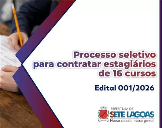 A Prefeitura de Sete Lagoas publicou, no Diário Oficial do Município desta terça-feira, 24, o Edital 001/2026, que regulamenta o Processo de Seleção de Estagiários para cadastro de reserva em vários cargos. A oportunidade é para a contratação de estudantes de cursos de educação superior ou do ensino médio em nível de educação profissional técnica. As inscrições gratuitas poderão ser realizadas de 27 de fevereiro a 16 de março de maneira online no link https://www.setelagoas.mg.gov.br/detalhe-da-materia/info/processo-seletivo-de-estagiarios-01-2026/82212.